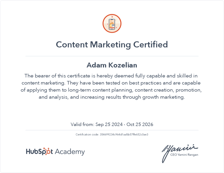 The content marketing certification strengthens my abilities in storytelling, strategic planning, and effective content distribution. It empowers me to create impactful, audience-driven content that drives engagement, providing me with a competitive edge through a respected credential.